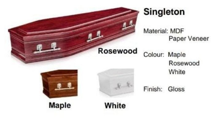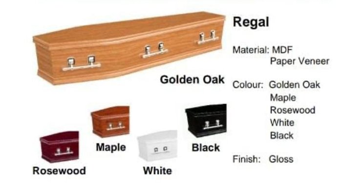 Our flat lid coffins is the Regal Range they come in either Golden Oak, Rosewood, Maple, Black and White. All in a Gloss finish.